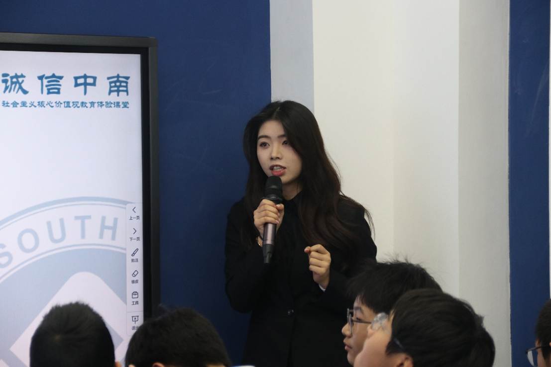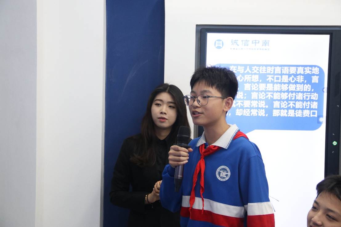 讲解员以古今中外有关诚信的 思考为例,揭示了诚信这一优良品质在日常生活的重要性,并让同学们举例日常生活中遇到的不诚信行为,教导同学们要对这些行为引以为戒。同学们踊跃发言,分享自己的见解,课堂气氛活跃。