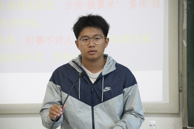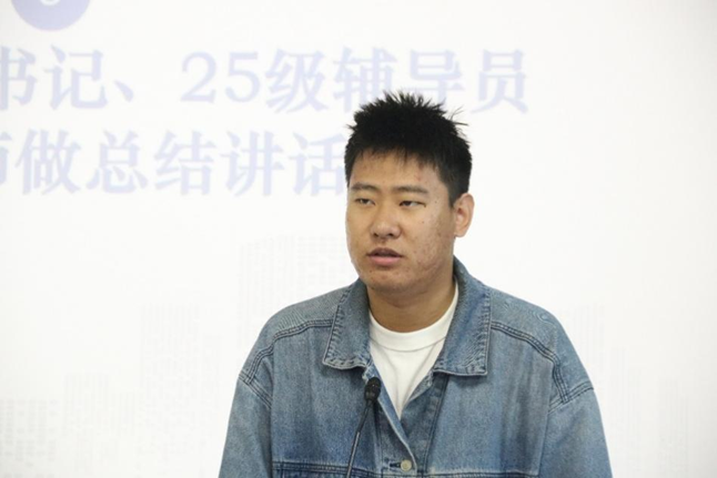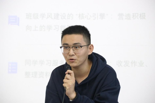 优秀学委张承博同学从学风建设方面分享了心得。他主要从学风建设、学习资源共享、学业帮扶等方面,重点讲解了做好学委工作的实用方法。他建议各位学习委员要主动了解同学们的学习需求,建立有效的学习交流平台,通过组织学习小组、开展考前辅导等方式帮助同学们共同进步。