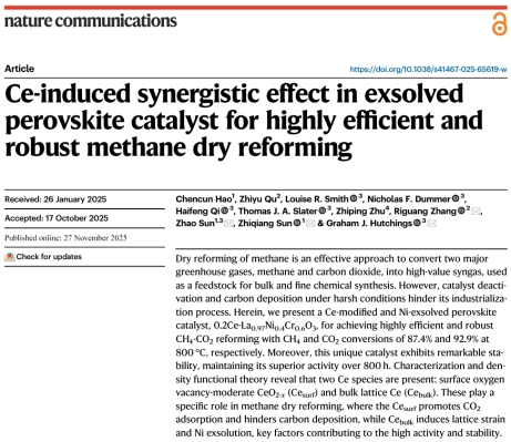 近日,我院孙志强教授团队在国际权威期刊《自然-通讯》(Nature Communications)上发表了题为“Ce诱导协同作用助力脱溶钙钛矿催化剂实现高效稳定的甲烷干重整”(Ce-induced synergistic effect in exsolved perovskite catalyst for highly efficient and robust methane dry reforming)的研究论文。2022级硕士生郝晨存为论文第一作者,孙朝副教授、孙志强教授、太原理工大学章日光教授、英国卡迪夫大学Graham J. Hutchings教授为共同通讯作者,中南大学能源科学与工程学院为第一署名单位和通讯单位。